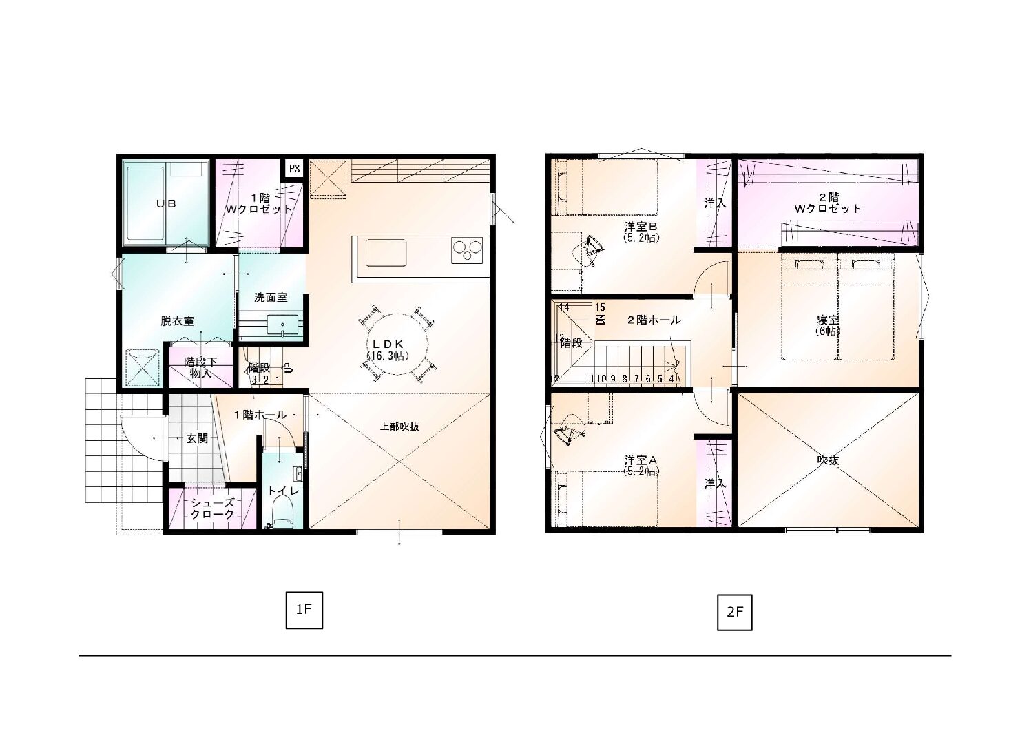3LDK(リビングダイニングキッチン 16.3帖(1階) 洋室 5.2帖(2階) 洋室 5.2帖(2階) 洋室6帖(2階) )