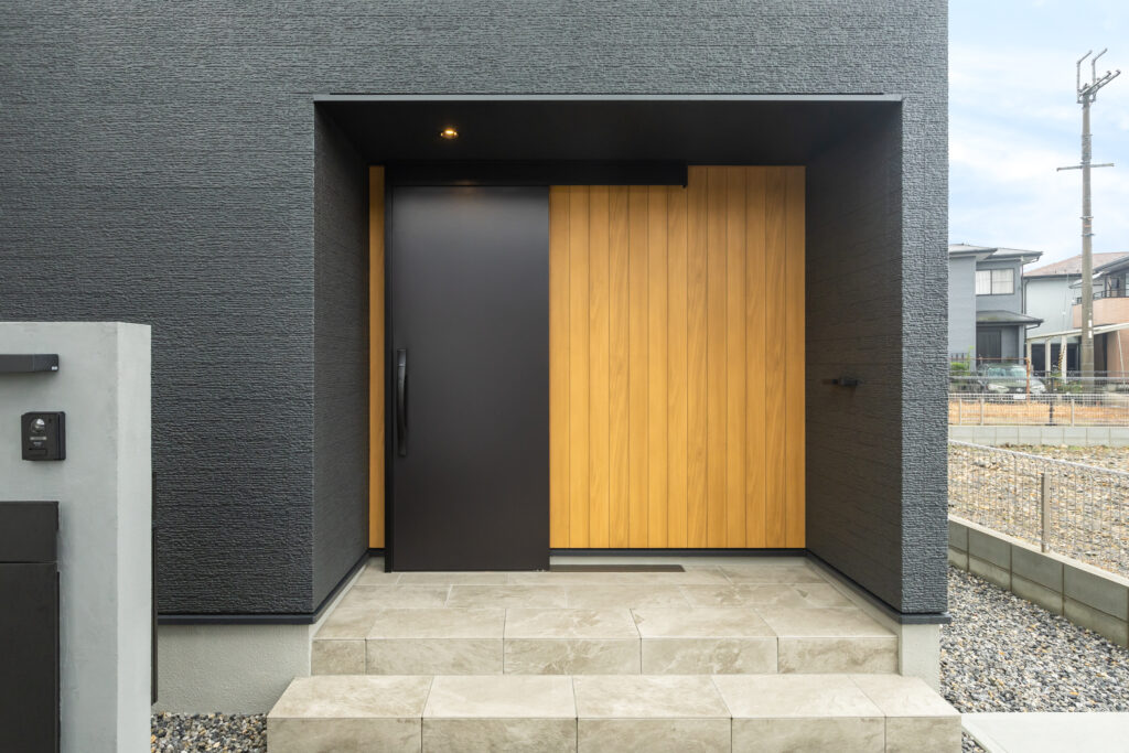 グレーの石目調タイルとブラックの外壁を組み合わせた、重厚感のあるスタイリッシュな外観。