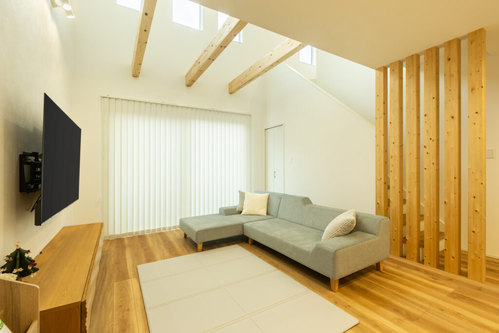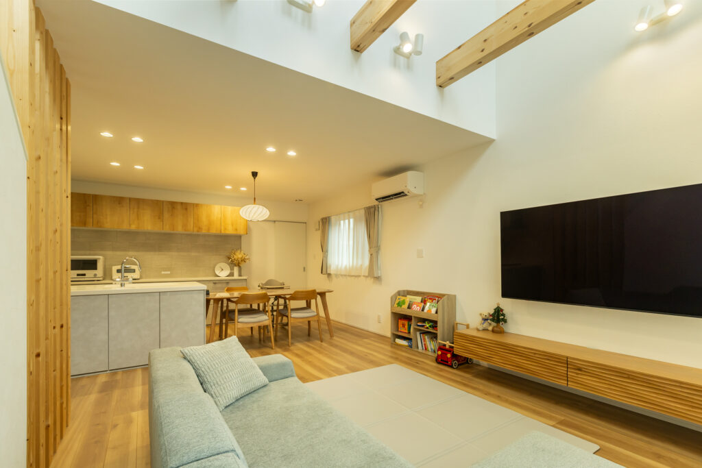 リビングの上部にはダイナミックな吹き抜けを設け、現しの化粧梁が空間のアクセントに。